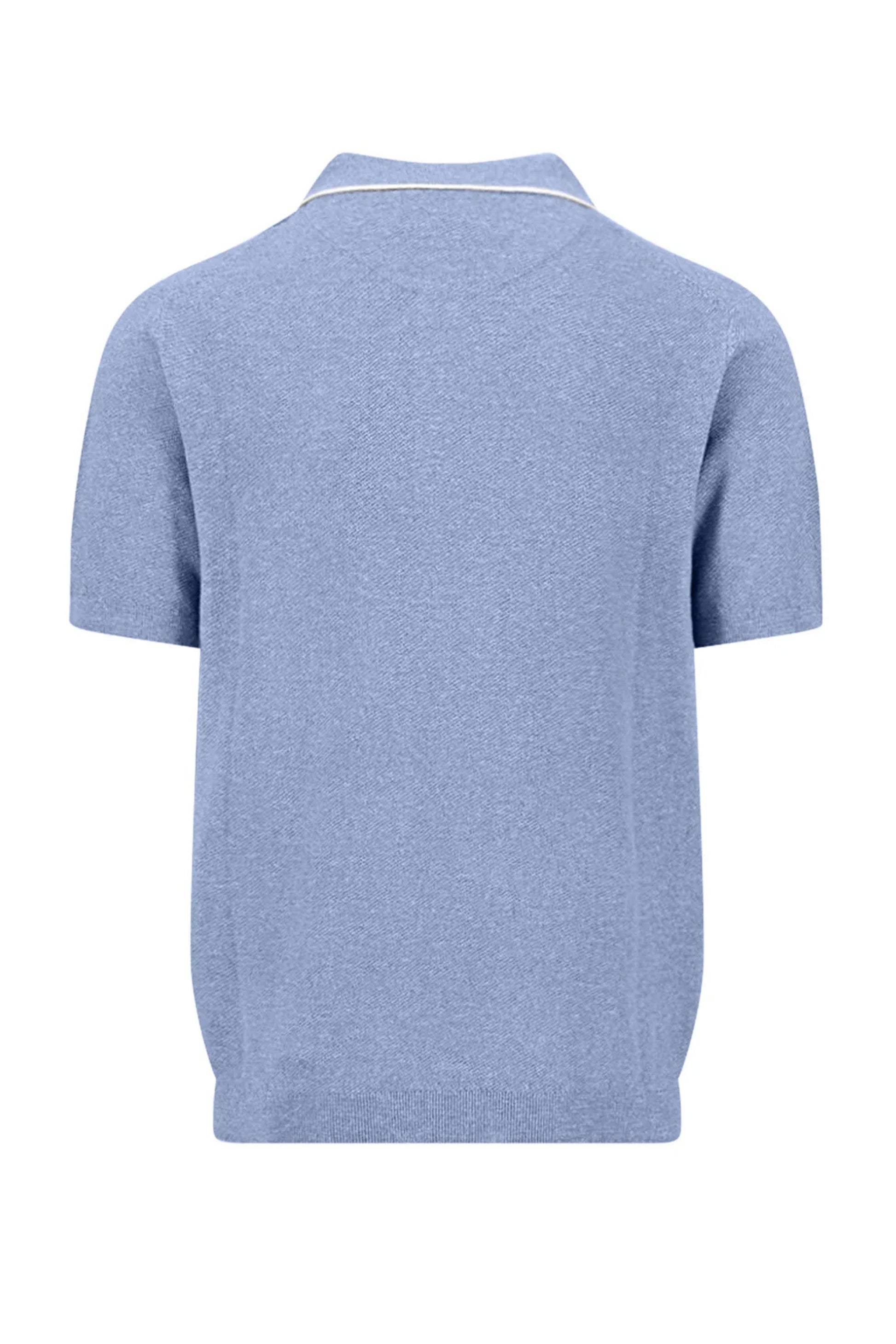 The Fynch Hatton knitted polo shirt in new breeze is a refined shirt fashioned from pure cotton for a lightweight. soft and breathable feel. its minimalist design makes it an easy wardrobe upgrade. The classic 2 button placket polo collar with contrast tipping lend to a sophisticated look that pairs well with a pair of chinos as it can be easily styled from casual to smart.