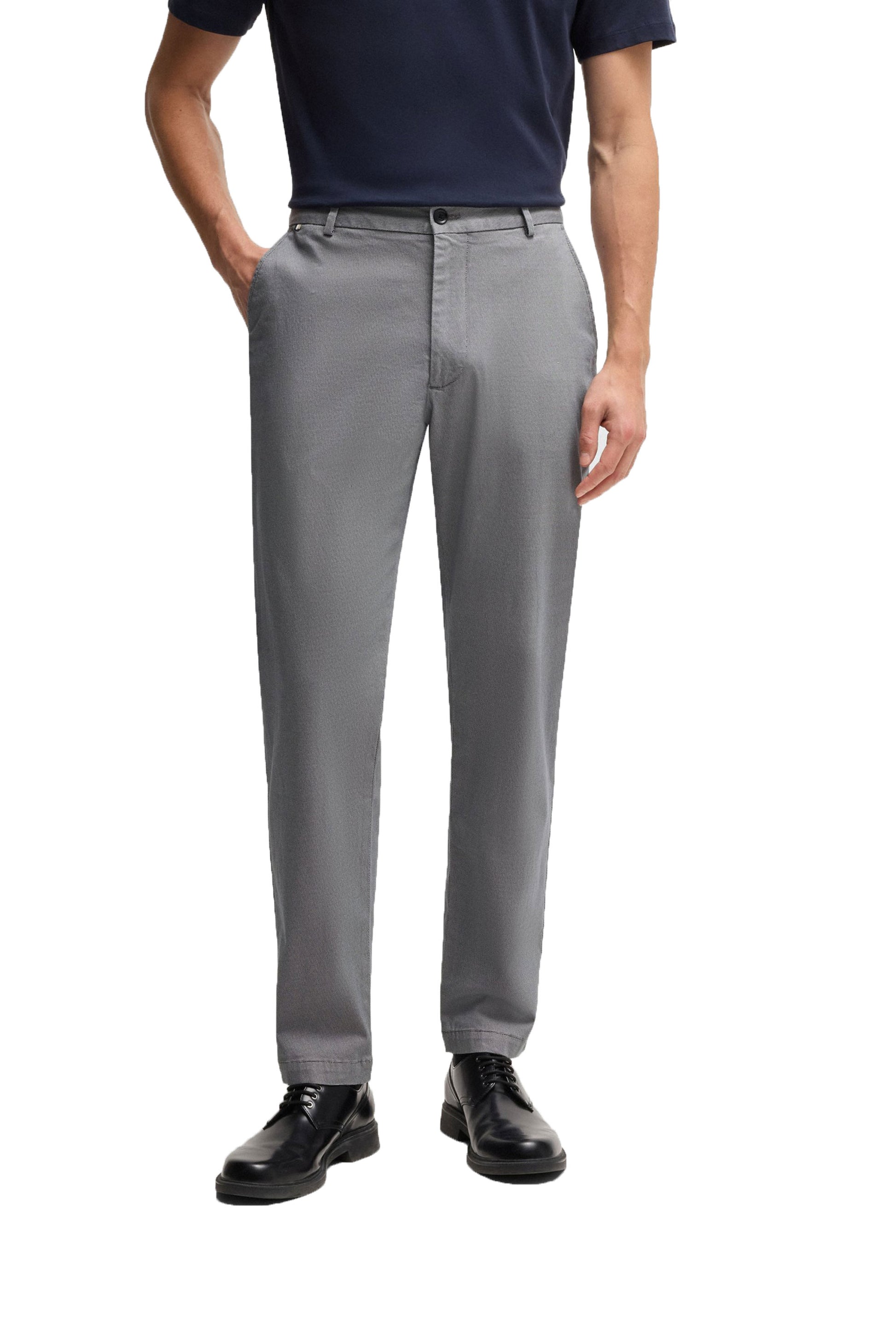 Designed with a comfortable regular fit and a classic regular rise, the H-Kane chino features a modern tapered leg that looks sharp with sneakers, loafers, or casual boots. Practical details include a secure button and zip closure, convenient French pockets at the front, and neat welt pockets at the back.