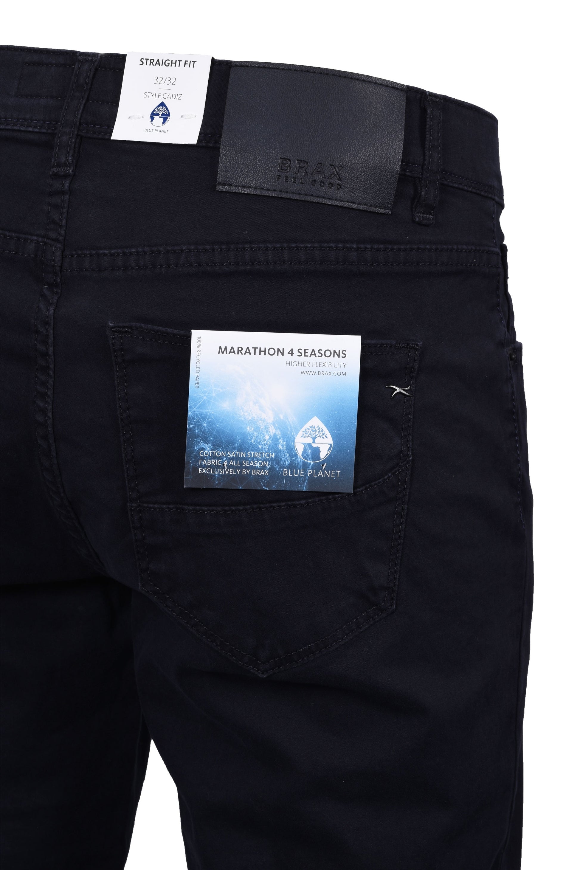 A classic pair of denim by Brax for your everyday wardrobe. The Cadiz are a slim fit straight leg style, coming in a navy colourway these jeans are crafted from an eco-friendly cotton blend for everyday comfort. A five pocket jean featuring signature Brax branding to the waistband and a metallic badge to the back pocket for authenticity.