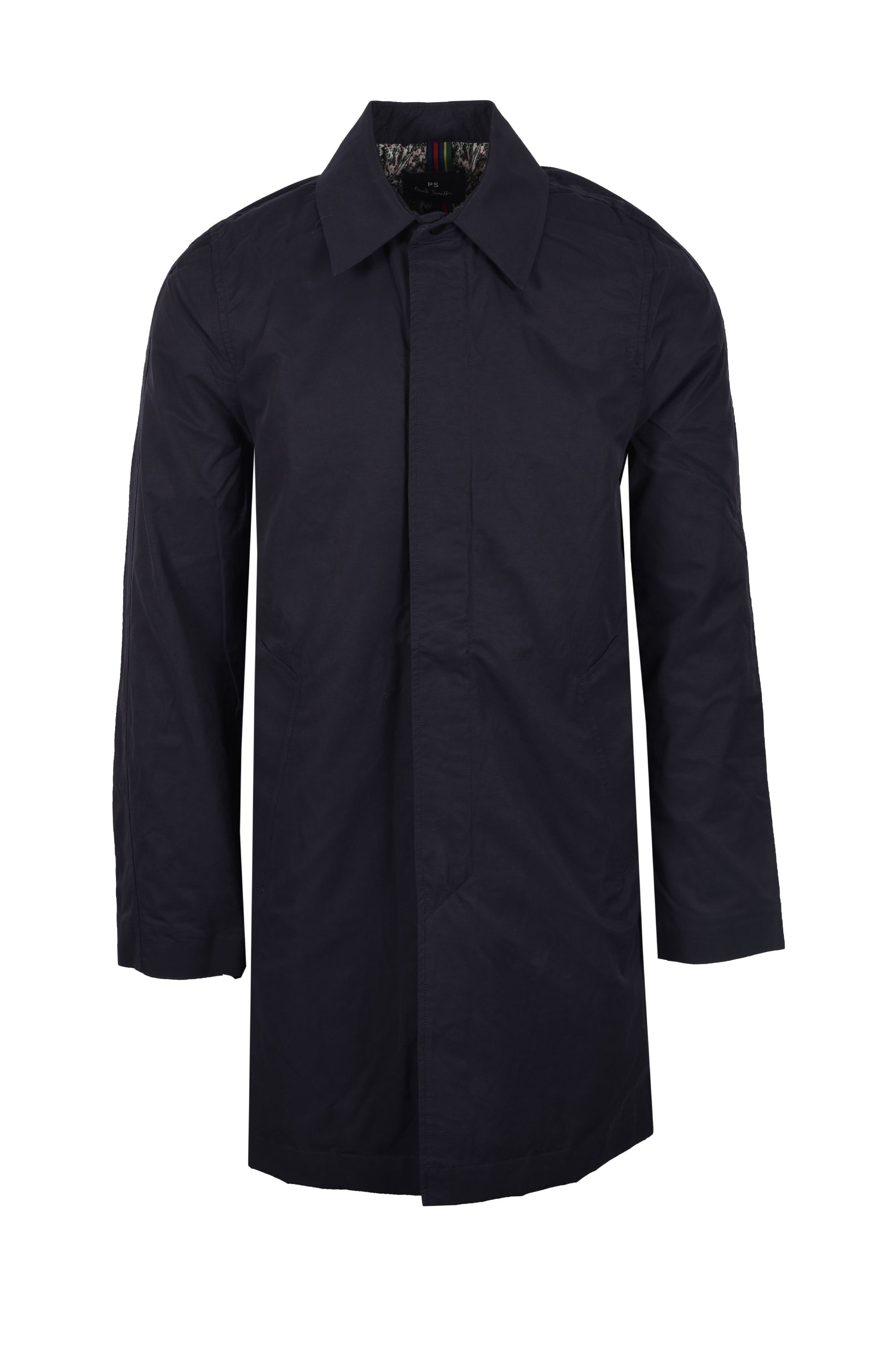 Discover the Paul Smith Dark Navy Mac coat, which is both adaptable and fashionable for any season. This outstanding garment is made of a sturdy blend of 60% cotton and 40% nylon, ensuring both comfort and longevity. Inside, a vivid floral lining made of 100% recycled polyester offers a distinct Paul Smith touch, standing out against the deep blue shell. This Mac is designed with functionality in mind, with a concealed zip closure for a sleek appearance. Whether you layer it over cosy knitwear or a pristine smart shirt, its lightweight design makes it the ideal transitional jacket for unpredictable weather.