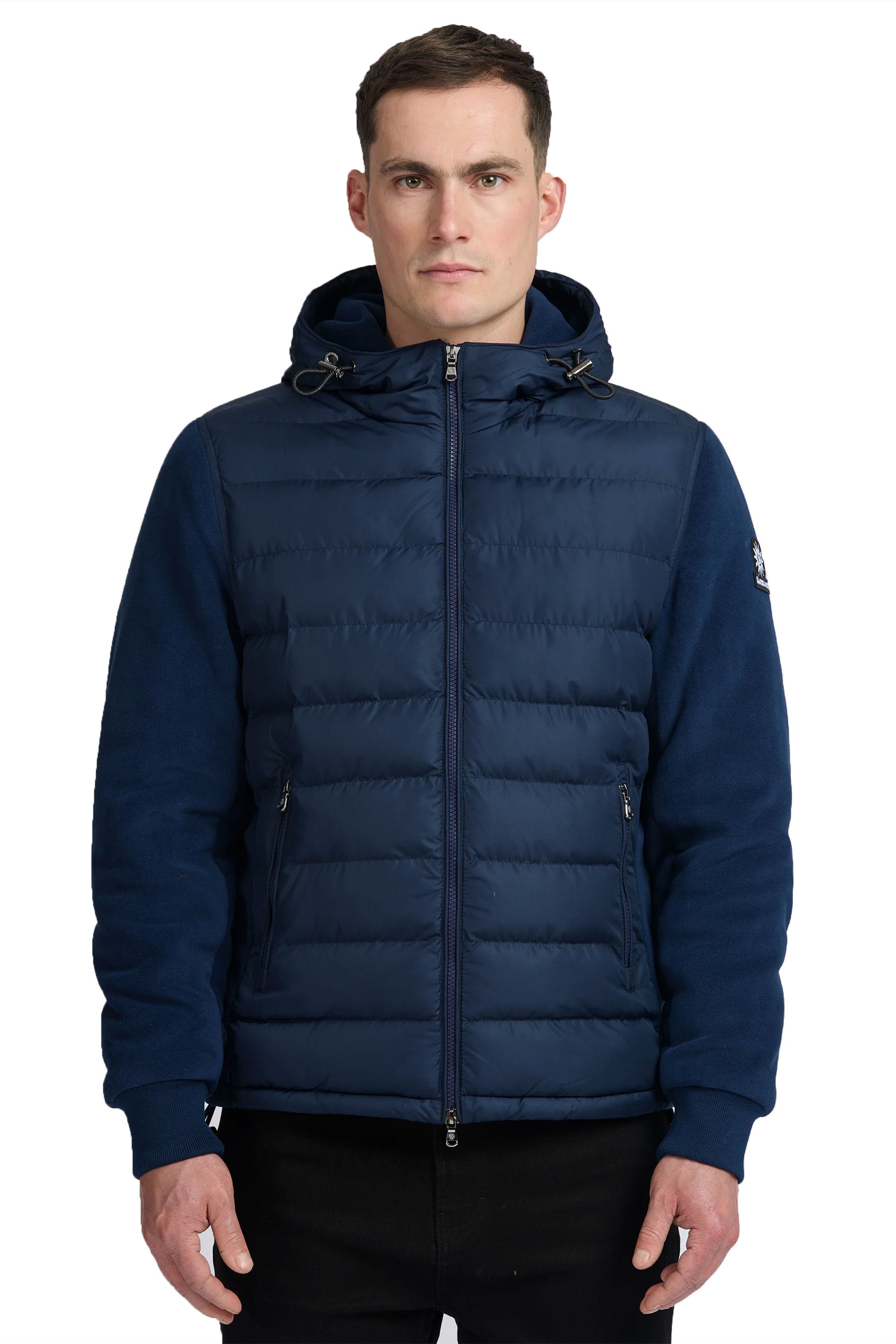 Sandbanks Outlander micro fleece hooded hybrid jacket - a warm and lightweight everyday casual jacket. This style features a warm eco down puffer filled front and rear, polar fleece sleeves, hood internal and pockets for comfort and warmth, YKK 2-Way Vislon front zip and side zip pockets, embroidered logo badge and finished with gun metal branded cord adjusters and eyelets.